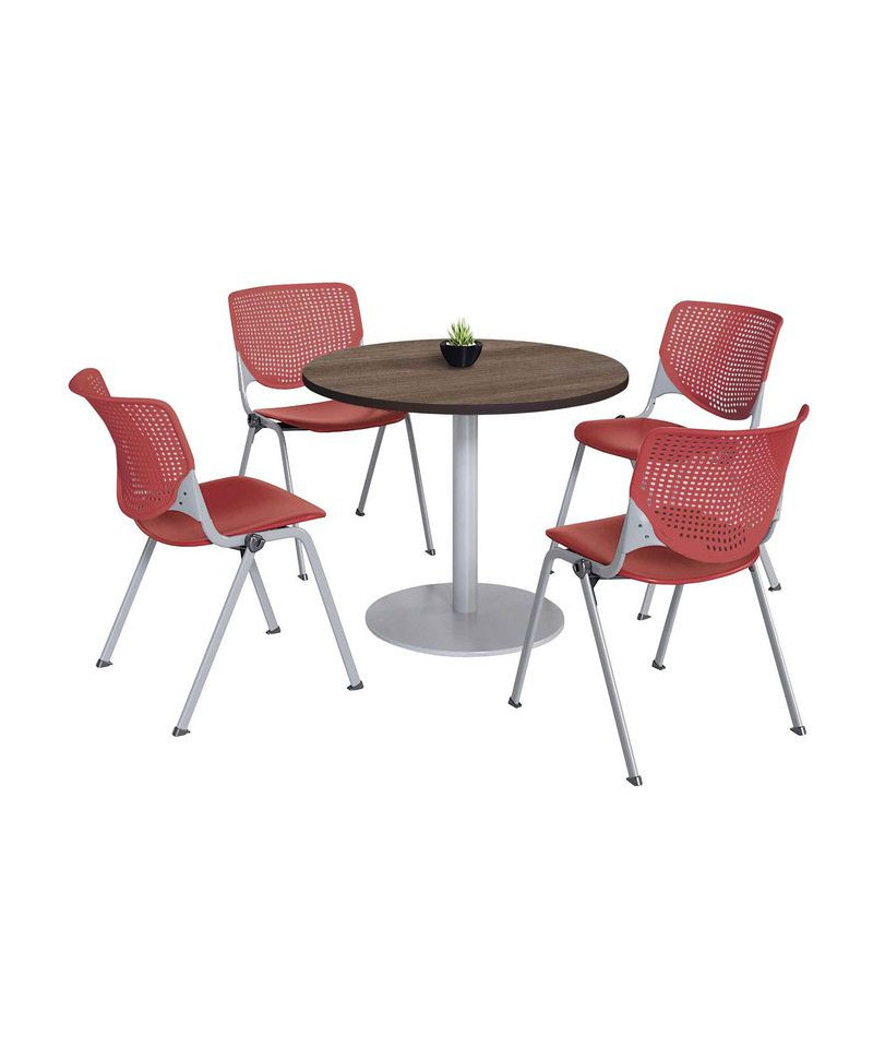 Contemporary and comfortable breakroom/cafeteria furniture. Table and 4 chair set. Table has a 1.25" thick high-pressure laminate top that's durable and easy to clean. The top has an attractive edge that won't crack or peel. The solid cast iron round base has leveling glides to prevent the table from wobbling on uneven floors. The base is made of durable cast iron with a 3" diameter column and is made of 16-gauge steel. The top and base are all shipped in one box. Easy to assemble. The chair has an "easy to clean" polypropylene seat and back. The ergonomic perforated back allows for enhanced circulation, while the radius conforms to your back for maximum comfort. The chair offers a contoured extra wide seat pan and a 400 lb. weight capacity to provide comfort and accommodate all sizes. The oval frame is made of 15-gauge steel with silver powder-coat. The 2300 is one of most complete stack chairs on the market. It's just plain.... KOOL. Tables shipped unassembled. Chairs shipped assembled.