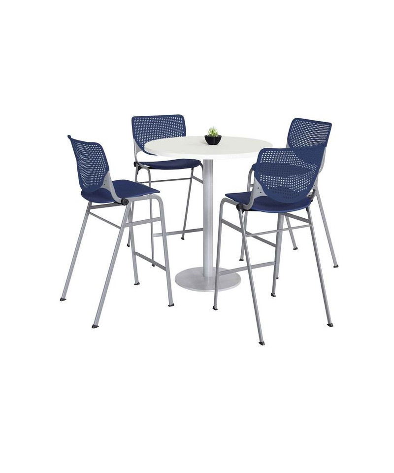 Pedestal Bistro Table with Four Navy Kool Series Barstools, Round, 36" Dia x 41h, Designer White
