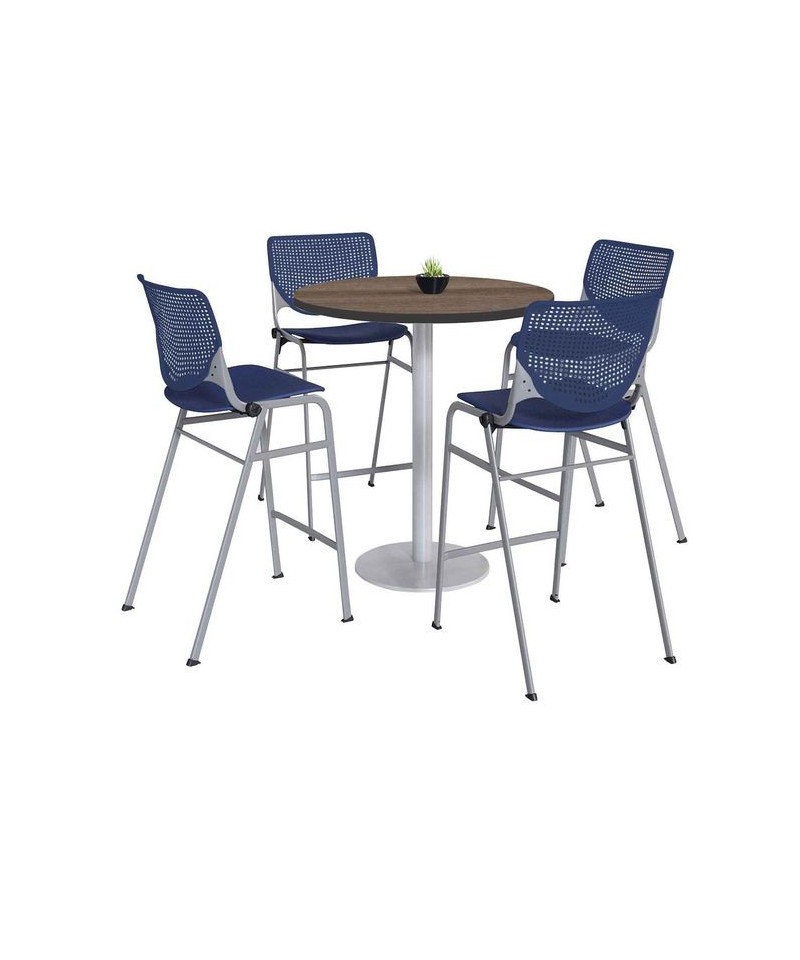 Pedestal Bistro Table with Four Navy Kool Series Barstools, Round, 36" Dia x 41h, Studio Teak
