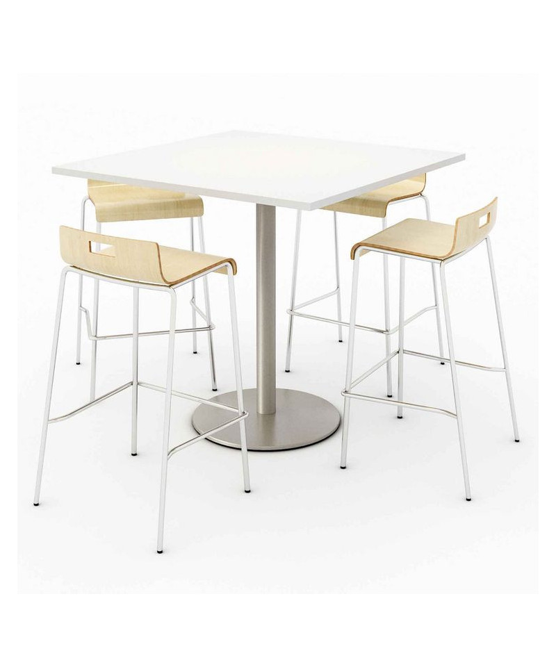 This bistro height pedestal table has a 1.25" thick high-pressure laminate top that's durable and easy to clean. The top has an attractive edge that won't crack or peel. The solid cast iron round base has leveling glides to prevent the table from wobbling on uneven floors. The column has a 3" diameter and is made of 16-gauge steel. The top and base are all shipped in one box. Easy to assemble. The chic, stylish and visually appealing stools are packed with versatility and function at affordable prices. Ideal for cafeterias, breakrooms, auditoriums and seminars or common areas. The durable frame is 0.75" round tubing made of 16-gauge steel. The attractive bent plywood shell has a high-pressure laminate finish for maximum durability and easy maintenance. The one-piece construction has a sle