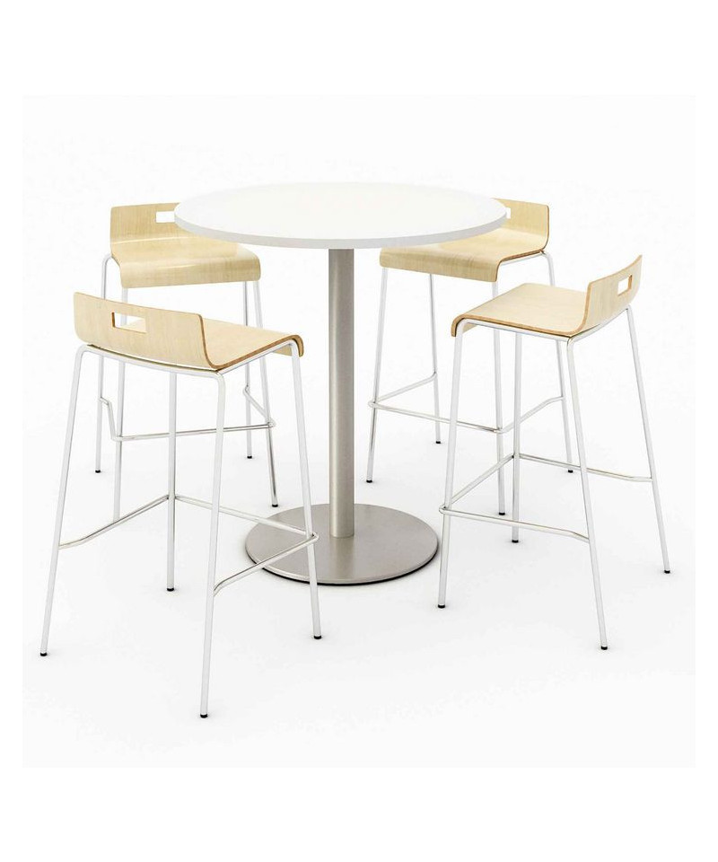 This bistro height pedestal table has a 1.25" thick high-pressure laminate top that's durable and easy to clean. The top has an attractive edge that won't crack or peel. The solid cast iron round base has leveling glides to prevent the table from wobbling on uneven floors. The column has a 3" diameter and is made of 16-gauge steel. The top and base are all shipped in one box. Easy to assemble. The chic, stylish and visually appealing stools are packed with versatility and function at affordable prices. Ideal for cafeterias, breakrooms, auditoriums and seminars or common areas. The durable frame is 0.75" round tubing made of 16-gauge steel. The attractive bent plywood shell has a high-pressure laminate finish for maximum durability and easy maintenance. The one-piece construction has a sle
