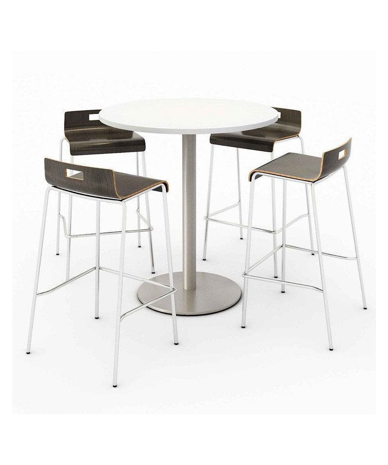 This bistro height pedestal table has a 1.25" thick high-pressure laminate top that's durable and easy to clean. The top has an attractive edge that won't crack or peel. The solid cast iron round base has leveling glides to prevent the table from wobbling on uneven floors. The column has a 3" diameter and is made of 16-gauge steel. The top and base are all shipped in one box. Easy to assemble. The chic, stylish and visually appealing stools are packed with versatility and function at affordable prices. Ideal for cafeterias, breakrooms, auditoriums and seminars or common areas. The durable frame is 0.75" round tubing made of 16-gauge steel. The attractive bent plywood shell has a high-pressure laminate finish for maximum durability and easy maintenance. The one-piece construction has a sle