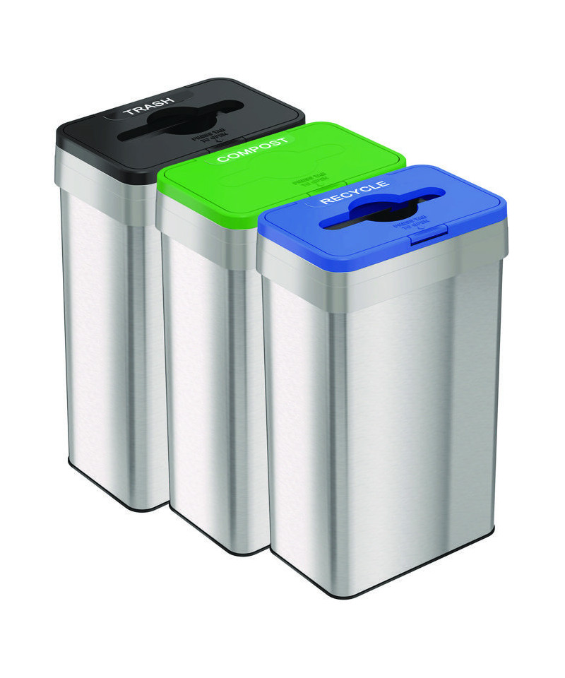 Streamline your facility's waste management with our set of three 21-gallon rectangular open top bins, each featuring a removable color-coded lid to designate trash, recycling, and compost. This comprehensive solution ensures efficient sorting and quick disposals, making it most appropriate for cafeterias, kitchens, and other food service areas, hospitality, medical, multi-family residential, and commercial environments. Dual odor filters maintain a fresh and clean atmosphere, while the sturdy stainless steel bodies and ABS plastic lids guarantee durability. Their slim, space-saving profiles integrate seamlessly into any professional setting. Enhance your space today with this efficient and practical waste management system!