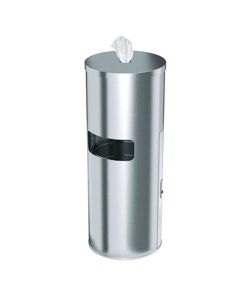 Enhance your facility with our stainless steel trash can featuring a built-in sanitizer gym wipe dispenser. This versatile unit combines a trash can with a wipe dispenser, making it ideal for high-traffic environments. The removable inner bucket with a locking door ensures secure waste management, while the dispenser accommodates all sizes of gym wipe refills. A security chain keeps the dispenser lid attached for added convenience. With its durable stainless steel construction and slim, space-saving design, this trash can is perfect for exercise facilities, hospitality, medical, multi-family residential, and retail environments.