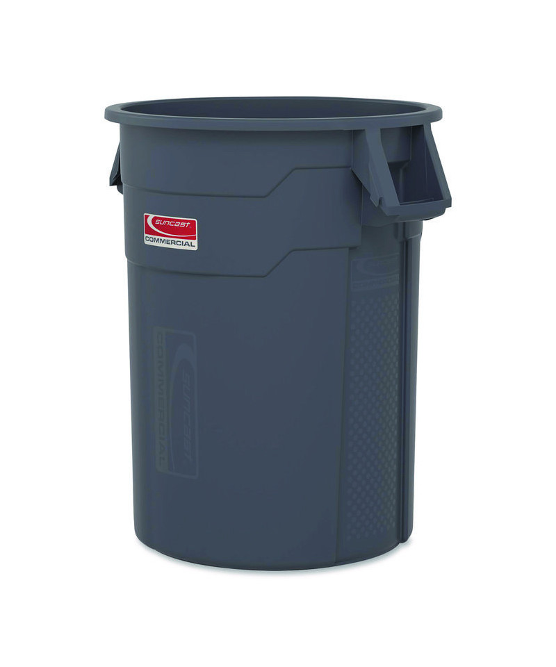 The Suncast Commercial® injection molded utility trash can is manufactured to last longer and be more durable than competing cans. This trash can will not rust and is resistant to denting and bending. The vented channels aid in reducing the force required to remove a filled can liner, while the side handles allow for an effortless lifting and easy transportation.