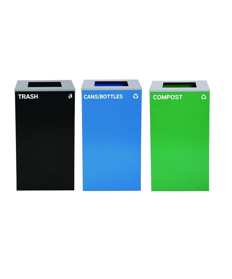 29 Gallon Trash/Recycling Cans, Steel, Blue Cans/Bottles Recycling Can, Green Compost Can, Black Trash Can with Square Lids
