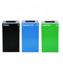 Set of 3, 29 gal Cans-Includes one blue Cans/Bottles Recycling Can, one green Compost Can and one black Trash Can each with Square Lids.