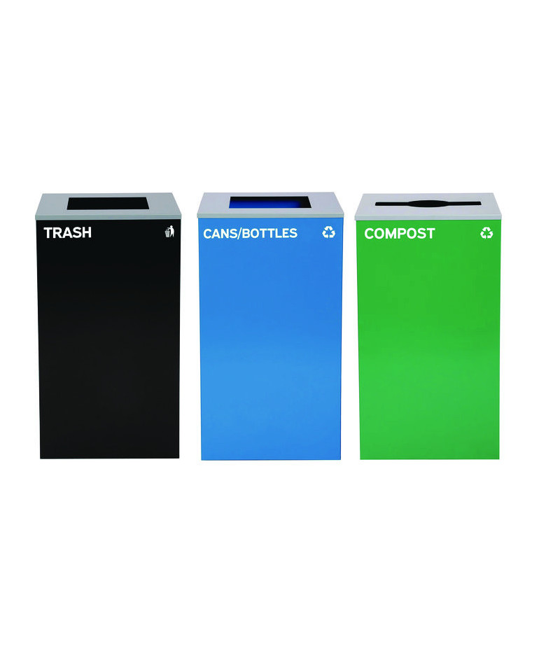 29 Gallon Trash/Recycling Cans, Steel, Blue Cans/Bottles Recycling and Black Trash Can w/Sq Lid, Green Compost Can Mixed Lid