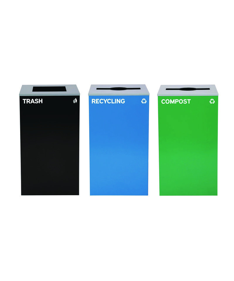 Set of 3, 29 gal Cans-Includes one blue Recycling Can and one green Compost Can each with Mixed Lids, one black Trash Can with Square Lid.