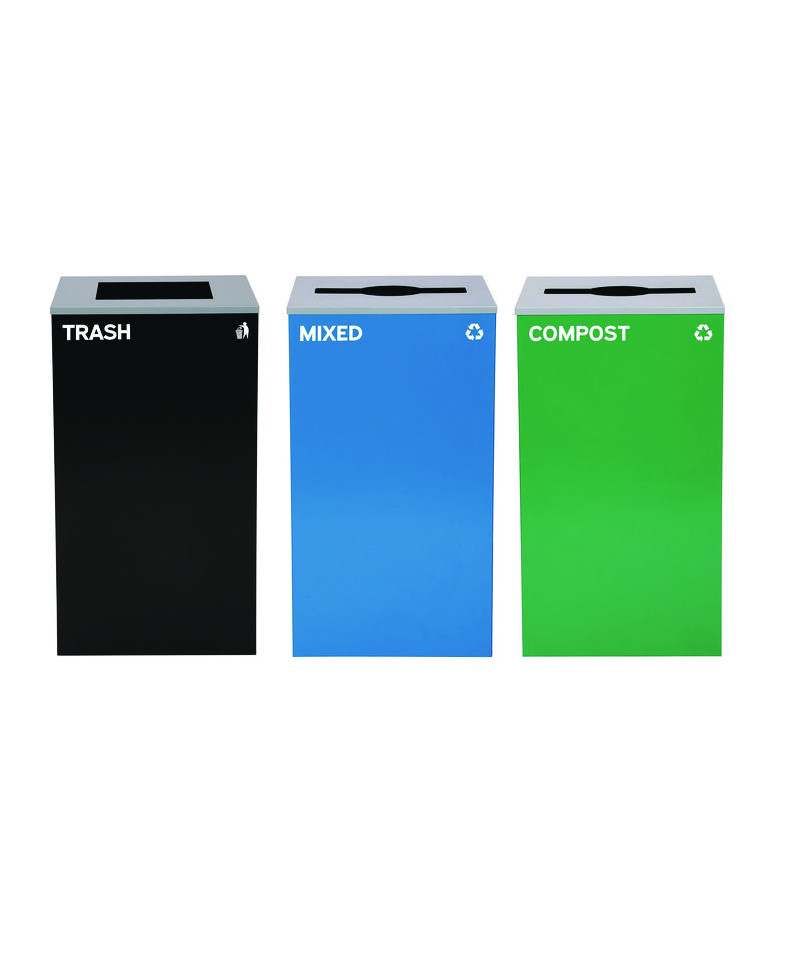 29 Gallon Trash/Recycling Cans, Steel, Blue Mixed Recycling and Green Compost Cans w/Mixed Lids, Black Trash Can w/Square Lid