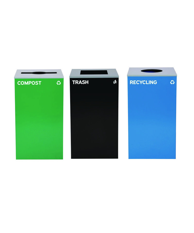 29 Gallon Trash/Recycling Cans, Steel, Blue Recycling Can w/Circle Lid, Green Compost w/Mixed Lid, Black Trash w/Square Lid