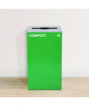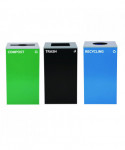Set of 3, 29 gal Cans-Includes one blue Recycling Can with Circle Lid, one green Compost Can with Mixed Lid and one black Trash Can with Square Lid.