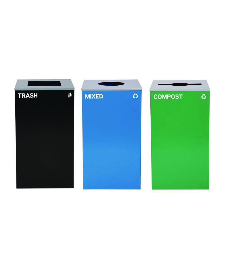 29 Gallon Trash/Recycling Cans, Steel, Blue Mixed Recycling w/Circle Lid, Green Compost w/Mixed Lid, Black Trash w/Square Lid
