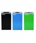Set of 3, 29 gal Cans-Includes one blue Mixed Recycling Can with Circle Lid, one green Compost Can with Mixed Lid and one black Trash Can with Square Lid.