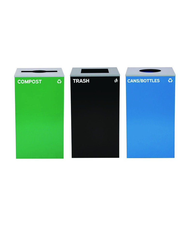 29 Gallon Trash/Recycling Cans, Steel, Blue Cans/Bottles Recycling w/Circle Lid, Green Compost w/Mixed Lid, BK Trash w/Sq Lid
