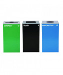 Set of 3, 29 gal Cans-Includes one blue Cans/Bottles Recycling Can with Circle Lid, one green Compost Can with Mixed Lid and one black Trash Can with Square Lid.