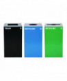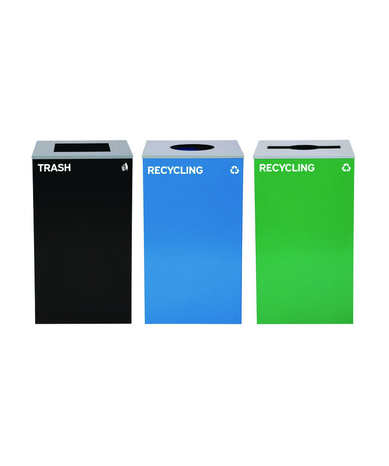 Set of 3, 29 gal Cans-Includes one blue Recycling Can with Circle Lid, one green Recycling Can with Mixed Lid and one black Trash Can with Square Lid.