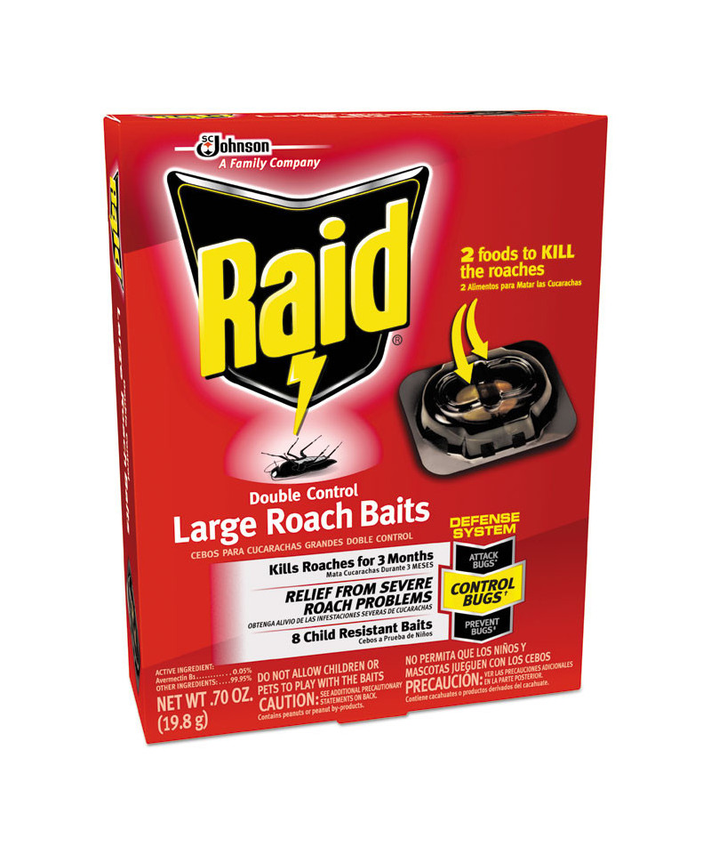 Raid Double Control Roach Baits kill the roaches you see as well as the ones you don't see with two types of bait. After roaches feed on the bait, they return to the nest and transfer the bait to the others. Population reduction and less activity can be expected within days, with the baits working continuously for up to three months. Raid Double Control Roach Baits are child-resistant. Read label before use. Use only as directed.