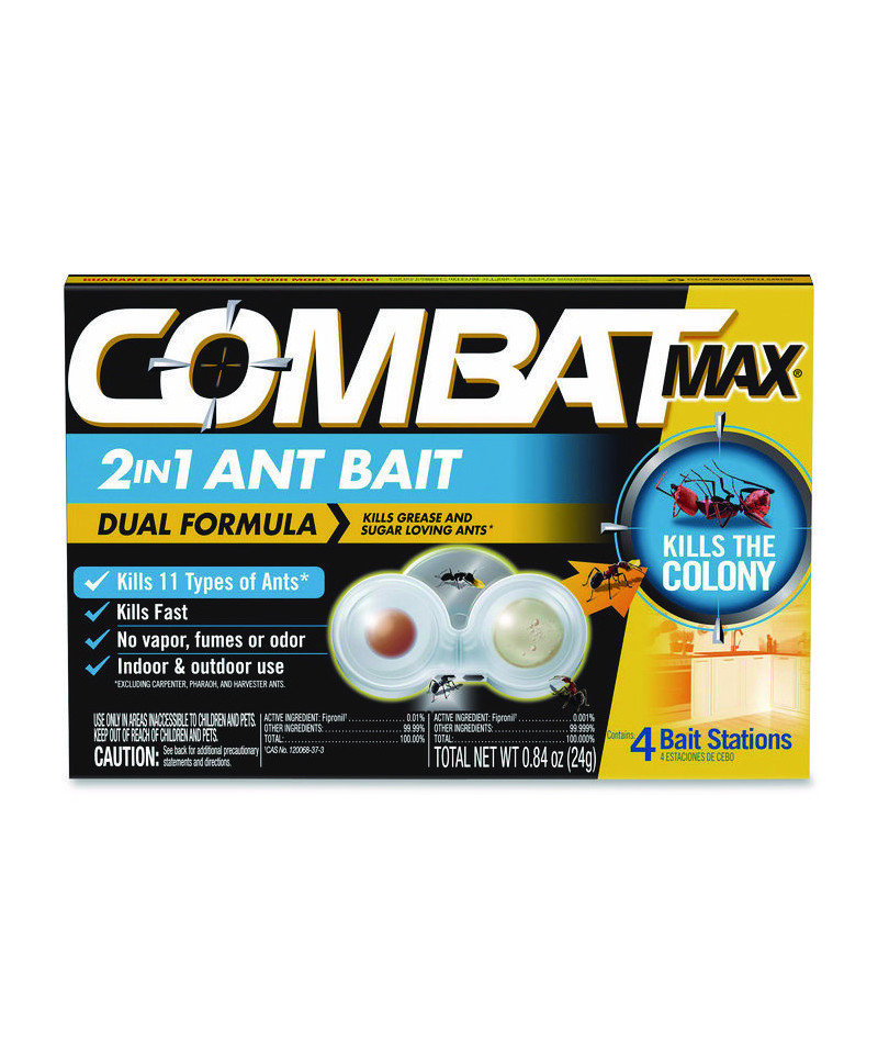 Combat Max 2-in-1 Ant Bait is formulated to attract ants quickly, acting as a necessary food and water supply for ants. Provides control of ants in as little as three to five days. This product is formulated to effectively control ants and uses two bait forms in a solid and gel. This product contains Fipronil, as its active ingredient. Its speed is slow enough for foraging ants to return to the colony/nest and feed the bait to larvae and queen so that the entire colony/nest is killed.