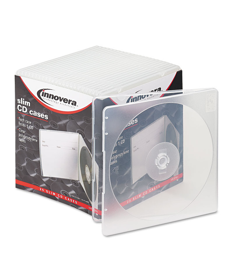 Streamline your disc storage with the Innovera slim CD cases. This pack of translucent polypropylene jackets lets you store CDs in just 40% of the space of standard jewel cases. The sturdy yet lightweight construction resists cracking and makes content easily viewable at a glance. Ideal for office archives, multimedia collections or on-the-go use. This slim, recyclable solution offers organized, efficient protection for your discs.