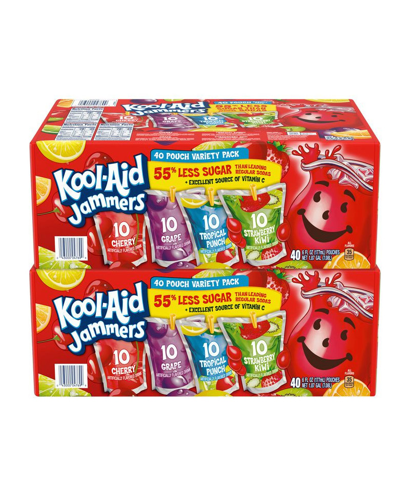 Real fruit juice and 100% daily value of Vitamin C make this Kool-Aid Jammers Juice Pouch Variety Pack a much better option than sugary sodas. Grab a pouch in one of four flavors, like Cherry, Grape, Strawberry Kiwi, or Tropical Punch and enjoy the classic deliciously fruity flavor of Kool Aid. This pack is perfect for packed lunches, or as an on-the-go drink.