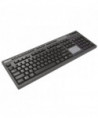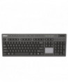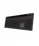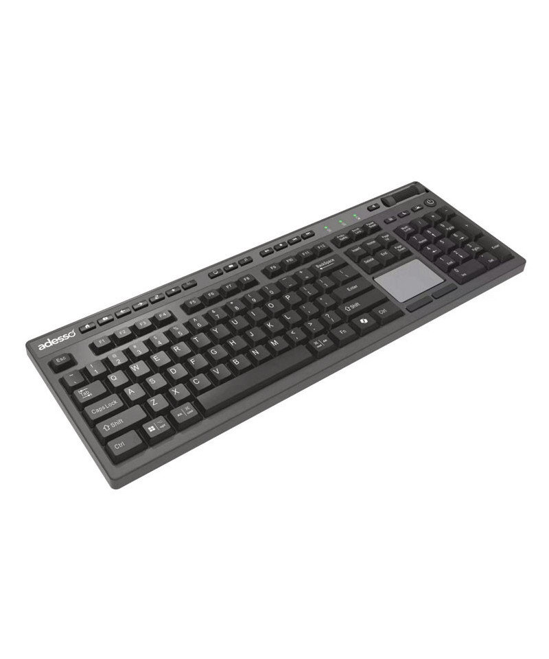 The Adesso WKB-4450UB multi OS wireless desktop touchpad keyboard lets you work without the limitations of cables, wires or line-of-sight receivers. This wireless keyboard is an all-in-one solution providing a full 104-key QWERTY keyboard layout, built-in touchpad, and multimedia and Internet hotkeys. In addition to your touchpad this keyboard also features a scroll pad and left and right mouse buttons so navigating documents and web pages is a breeze, without ever using a mouse! Now you can control every aspect of your PC from one convenient location. With its clean lines, elegant chrome accents, and piano finish design the keyboard adds style to any room at home or at the office. This touchpad keyboard offers the freedom to use your keyboard on most devices such as PCs, Notebooks, iPad, iMac and smartphones that support USB connection. No matter what you are doing on the computer, you can now enjoy working at any angle and at a distance of up to 30 feet and have minimal interruptions with 65,000 auto switching IDs over 12 channels. The keyboard also features an integrated built-in touchpad which can take the place of your mouse, making it easier to control the movement of the cursor in your personal computer. Control all aspects of your user experience with one-touch using the built-in Internet, multimedia, and desktop Hotkeys. Quickly complete your tasks with 13 Windows keys that let you quickly navigate your files and the web while taking full control of your multimedia entertainment with seven multimedia hotkeys.
