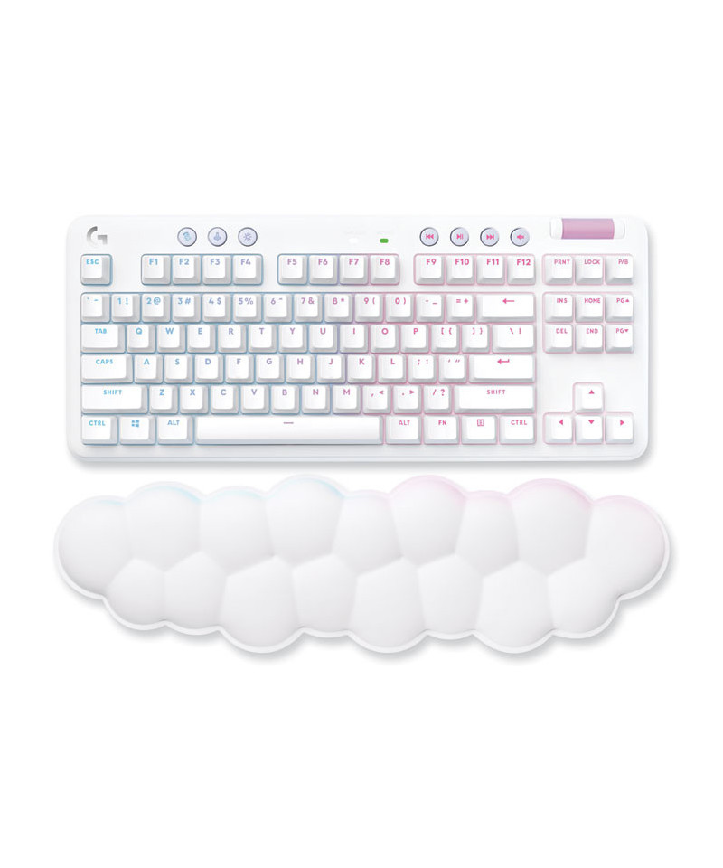 Part of the Aurora Collection, G715 Wireless Gaming Keyboard is a compact, comfy keyboard that delivers low-key vibes with high-key performance so you can express yourself and play your way. Float away with its dreamy white design and cloud-soft palm rest. A compact, tenkeyless layout, and adjustable height give that good game feeling, all-day long. Pack it up, place it anywhere, and play your best with a rechargeable 25-gaming-hour battery life and LIGHTSPEED wireless or Bluetooth® connectivity. Show off your play style with ethereal LIGHTSYNC RGB on the keyboard perimeter and under the keys along with out-of-the box Aurora Collection signature lighting. Customize your look with key caps and top plates in a variety of fun colors including Pink Dawn and Green Flash (sold separately).