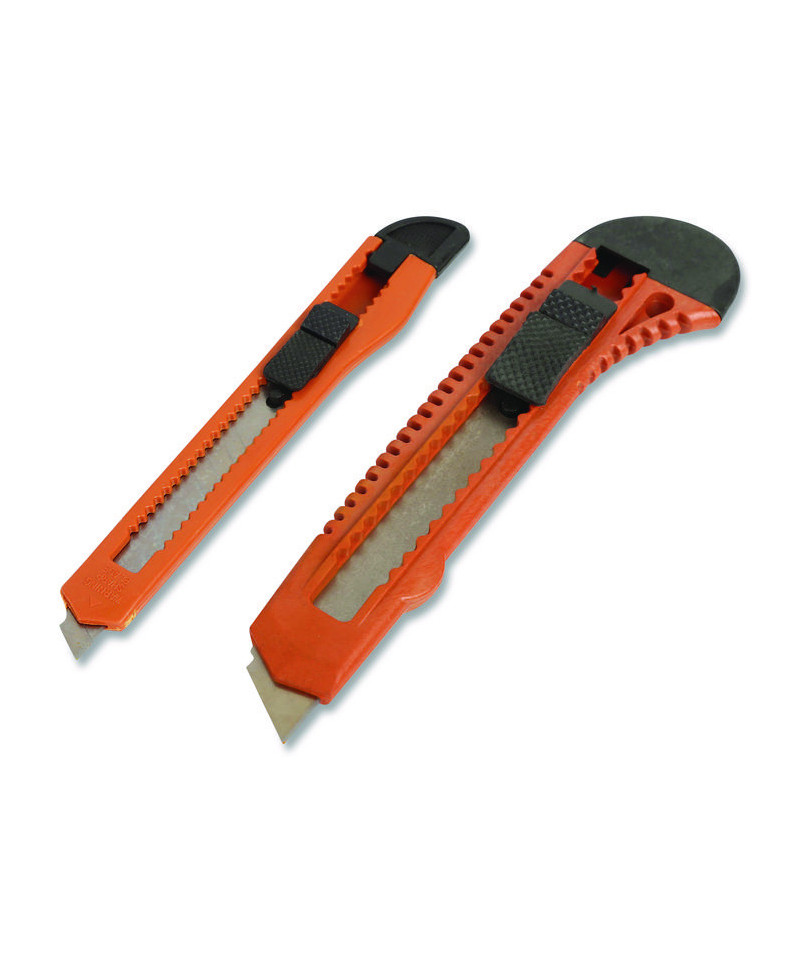 The Great Neck®-2 Piece Snap-Off Utility Knife Set includes a 9 mm and 18 mm snap-off knife and is perfect for light duty cutting of paper, vinyl, and leather. The end of the blade snaps off easily to provide a fresh new cutting edge, with a locking slide to ensure safety. A convenient pocket clip makes it easy to carry around.