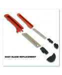 Easy-to-load knife has a 10-blade chamber. Ergonomic comfort grip makes it easy and safe to use. Perfect for tough cutting tasks. Includes 10 blades.