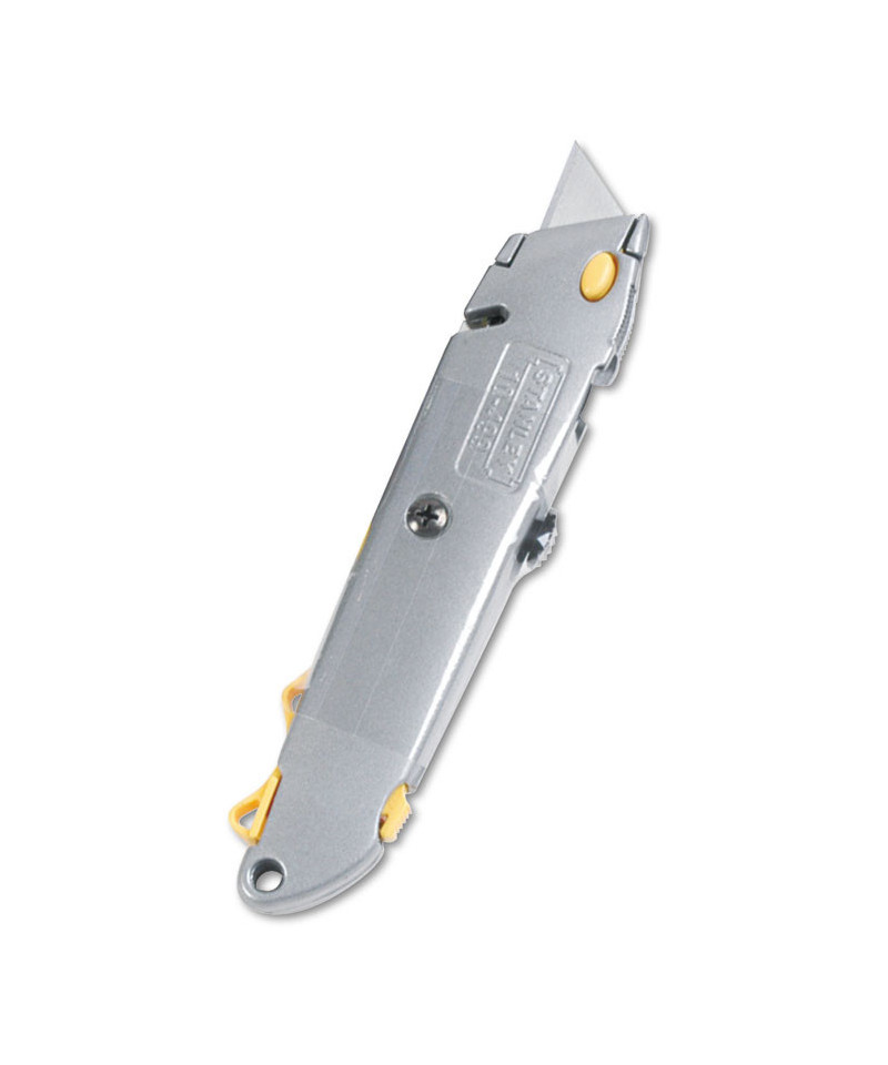 Save valuable work time with the Quick-Change Retractable Utility Knife from STANLEY®. Change blades fast without the need for a screwdriver. This utility knife cuts many types of materials including cardboard, drywall, plastic sheeting, leather and more.