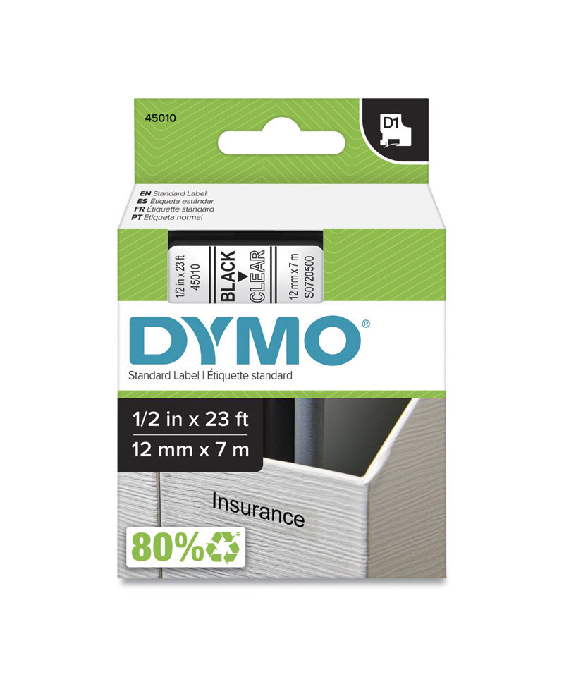 D1 High-Performance Polyester Removable Label Tape, 0.5" x 23 ft, Black on Clear