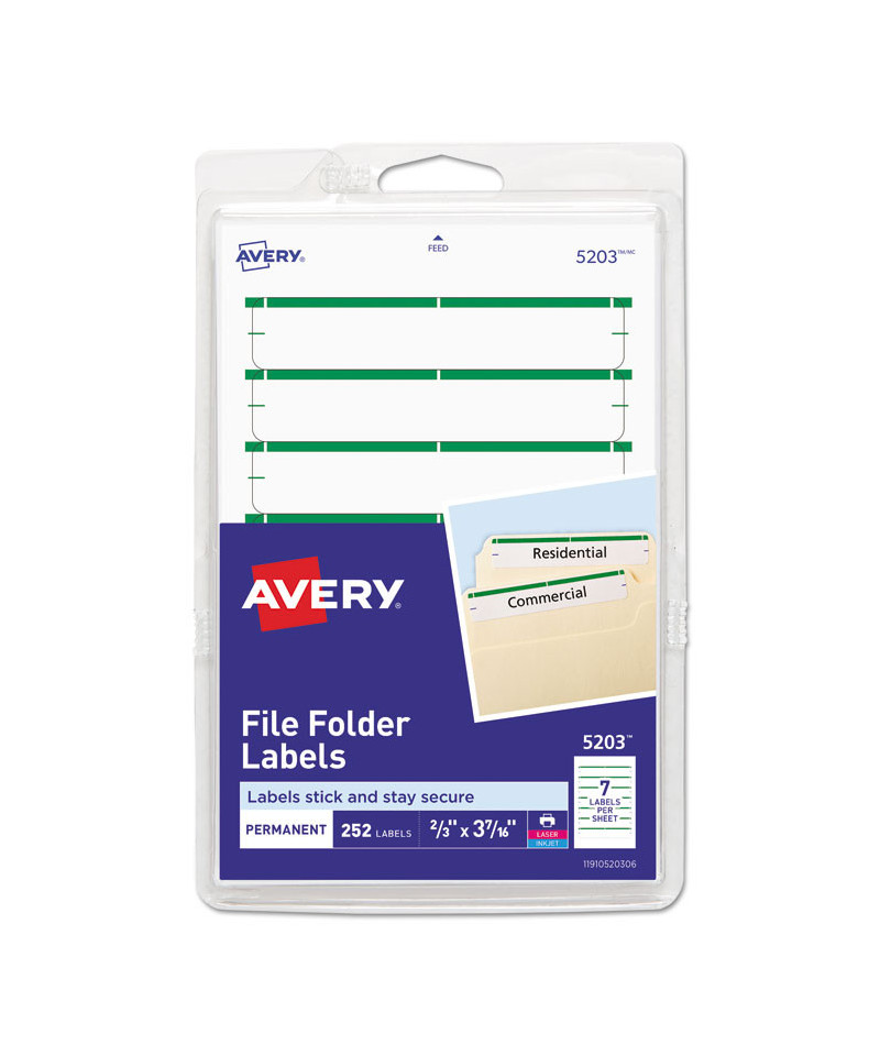 Make file folders stand out with a professional look. These file folder labels feature a strip of eye-catching color at the top to make it even easier to find just the folder you're looking for and are great for color coding. Write on the labels by hand or use the free templates available from Avery® Design & Print to format them easily on your computer and print them with your laser or inkjet printer. The permanent adhesive ensures that your label will stay put without curling away. For a truly standout design, it's hard to beat these convenient labels.