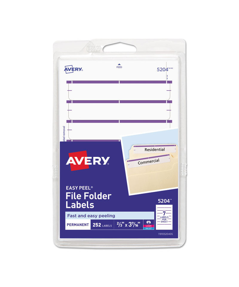 Make file folders stand out with a professional look. These file folder labels feature a strip of eye-catching color at the top to make it even easier to find just the folder you're looking for and are great for color coding. Write on the labels by hand or use the free templates available from Avery® Design & Print to format them easily on your computer and print them with your laser or inkjet printer. The permanent adhesive ensures that your label will stay put without curling away. For a truly standout design, it's hard to beat these convenient labels.