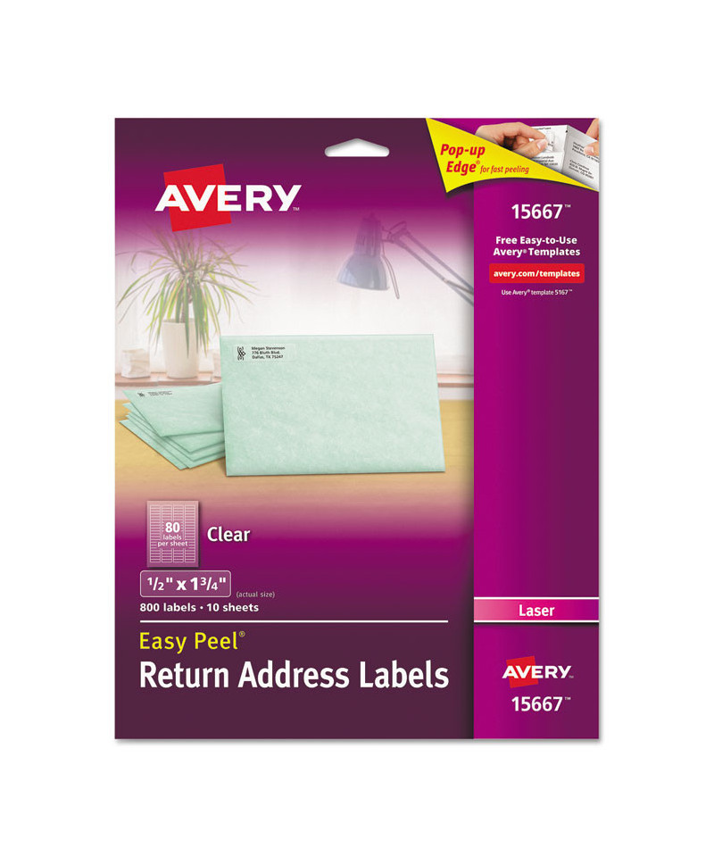 All your mailing is easier with these Clear Easy Peel® Mailing Labels. Labels virtually disappear on white and light colored surfaces. These labels feature exclusive Avery® Sure Feed® technology to improve print alignment and avoid jamming. The blue, textured strip on the top of each sheet provides better grip for printer rollers and helps feed the sheet through your printer. Ultrahold® permanent adhesive makes sure that these labels stick and stay without peeling, curling or falling off. The Pop-up Edge offers fast peeling--just bend the label sheet to expose the label edge, peel, then fold the sheet back to flat in a jiffy. They're also great as gift tags or as ID and organization labels. Easily import names, addresses and logos and print on your labels with free templates and designs from Avery® Design & Print. Get pages of professional-looking labels filled with eye-catching text and graphics.