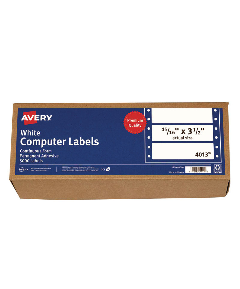 Print large quantities of labels on continuous label sheets with Avery labels for pin-fed and dot matrix printers. Each sheet is perforated so that you can easily separate the labels. Each label uses permanent adhesive that sticks and stays securely without having the corners lift and curl. The permanent adhesive works great on paper, cardboard, glass, and metal and are ideal as mailing and shipping labels. Perfect for big projects and large quantities, continuous-feed labels let you print thousands of labels without having to constantly reload sheets into a standard desktop printer. Easily print address labels, shipping labels, product labels, file folder labels, barcode labels and more.