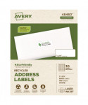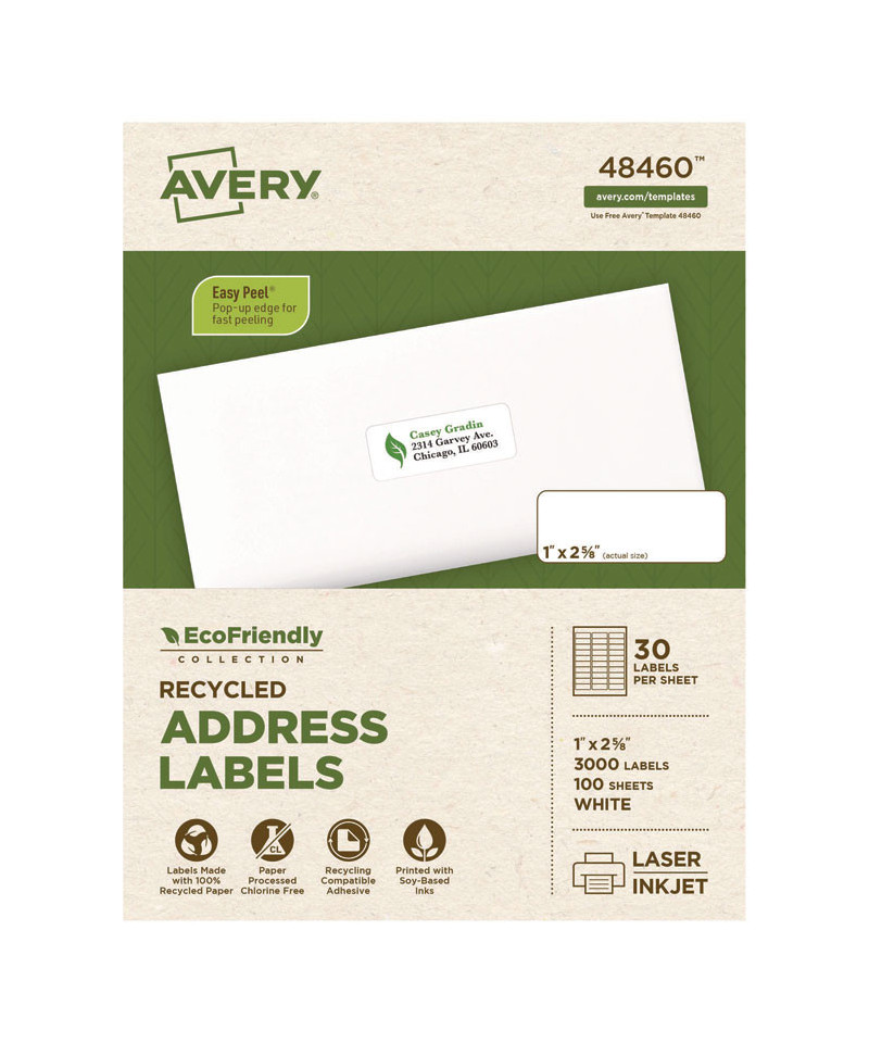 A natural choice for doing right by the environment. EcoFriendly mailing labels are made of 100% recycled material, processed Chlorine Free and printed using soy based ink. Easy to customize with free templates from Avery® Design & Print. 8.5 x 11 sheets for laser and inkjet printers.