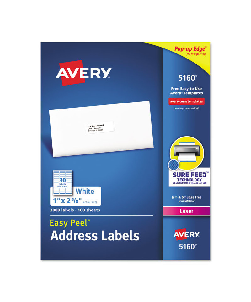 Create professional address labels quickly and easily. Perfect for high-volume mailing projects, labeling bottles, jars, food containers, product branding, event decorations, and more. Labels with Sure Feed® technology are designed to provide a reliable printer feed to help prevent misalignments and jams. The proprietary Easy Peel® feature makes applying the labels a breeze. Just bend the label sheet to expose the Pop-up Edge®, peel off the label and fold the sheet back to flat. Easy to customize with free designs and templates from Avery® Design & Print. 8.5" x 11" sheets for laser or inkjet printers.