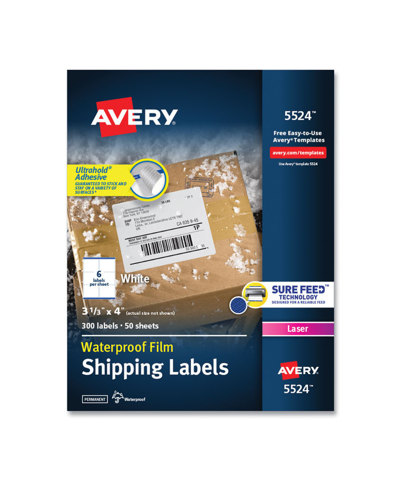 Don't let a little rain or snow worry you when you need to send a package. Waterproof labels stand up to the toughest environmental conditions and extreme temperatures, while resisting scuffs, tears and smudges, so they remain easy to read. Ultrahold® Adhesive sticks to more tough surfaces: metal, plastic, glass and more, ensuring your label doesn't fall off your package. They also resist. TrueBlock® Technology completely covers everything underneath your label, so you can reuse boxes, mailing tubes and more. With free printable templates and designs from Avery® Design & Print, you can create custom labels with sharp text and graphics in minutes. Waterproof and UV-resistant. 8.5" x 11" sheets for laser printers.