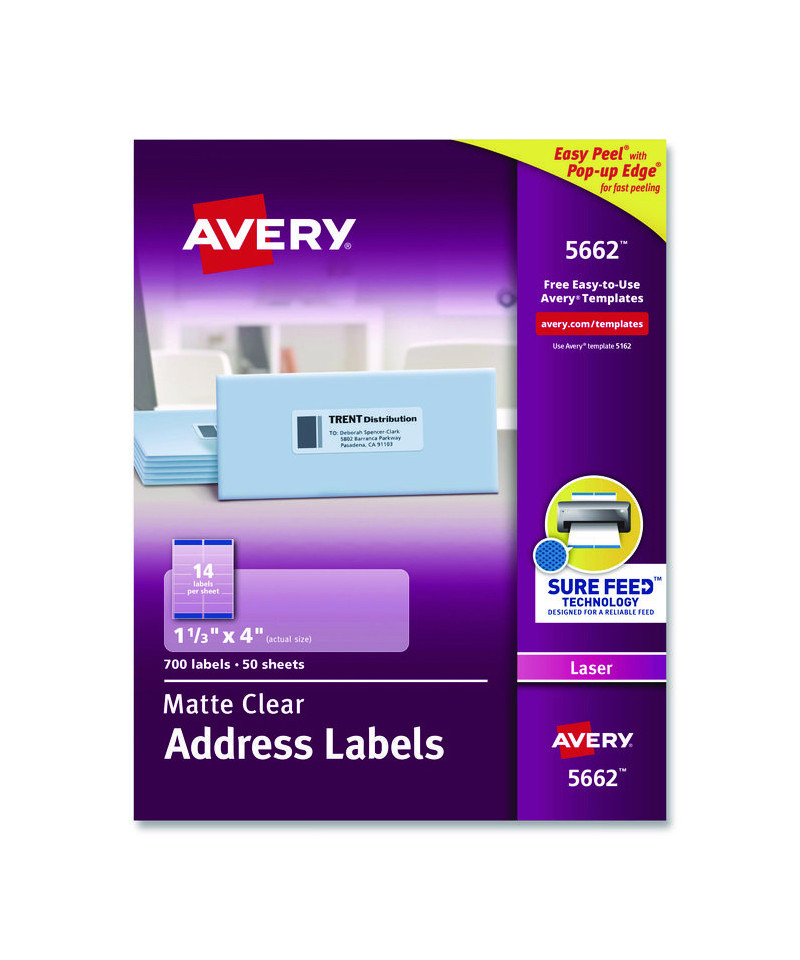 All your mailing is easier with these Clear Easy Peel® Mailing Labels. Labels virtually disappear on white and light colored surfaces. These labels feature exclusive Avery® Sure Feed® technology to improve print alignment and avoid jamming. The blue, textured strip on the top of each sheet provides better grip for printer rollers and helps feed the sheet through your printer. Ultrahold® permanent adhesive makes sure that these labels stick and stay without peeling, curling or falling off. The Pop-up Edge offers fast peeling--just bend the label sheet to expose the label edge, peel, then fold the sheet back to flat in a jiffy. They're also great as gift tags or as ID and organization labels. Easily import names, addresses and logos and print on your labels with free templates and designs from Avery® Design & Print. Get pages of professional-looking labels filled with eye-catching text and graphics.