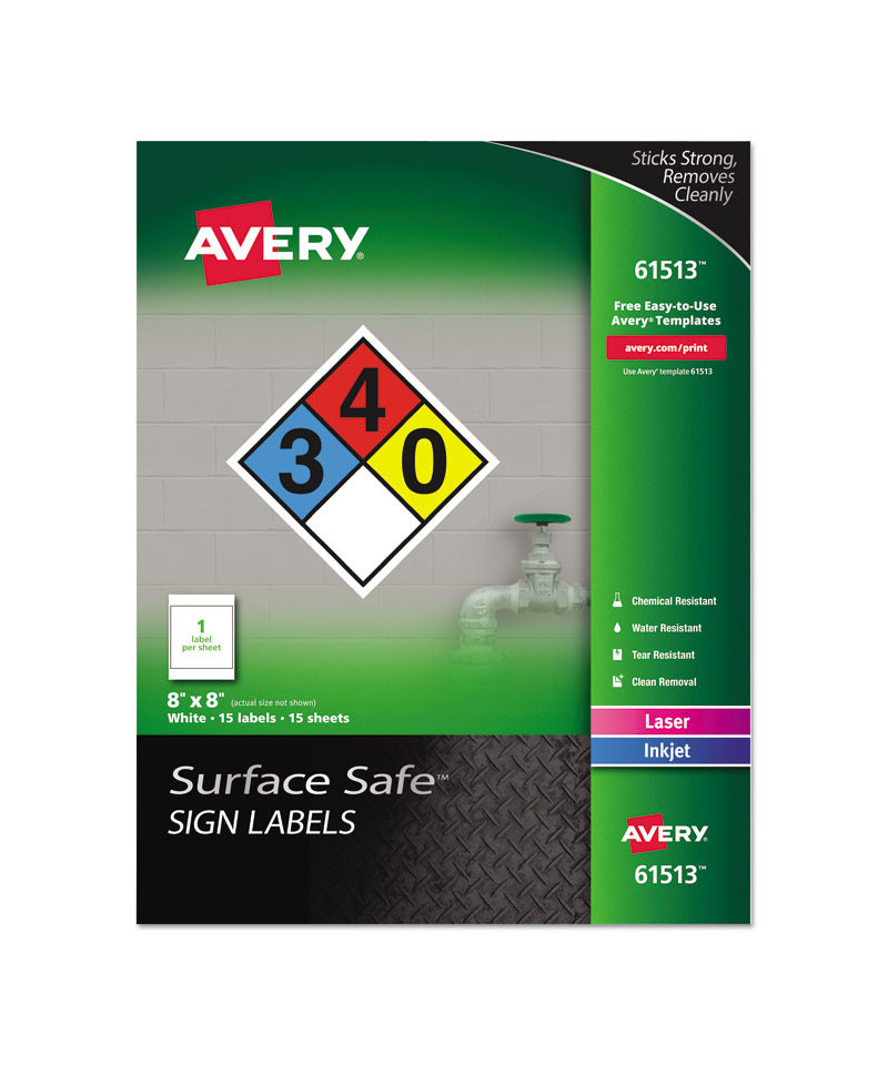 Easily create cost-effective removable label signs that will help maintain a safe workplace without damaging walls and paint. Made of durable, professional-grade material, and engineered to resist water, chemicals and hold up to wear and tear in warehouses and on the manufacturing floor. Specially designed Surface Safe® adhesive sticks securely yet removes cleanly from painted walls, drywall, metal and glass without any residue or damage to surfaces. For laser and inkjet printers - no special label or sign printer required. Customize and print using Avery® Design and Print software. Choose from hundreds of stock designs that are compliant with ANSI® and OSHA®, or customize your own.