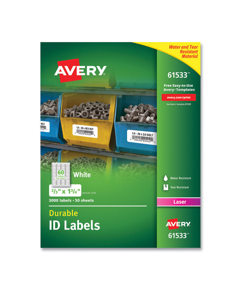 These white permanent durable ID labels with TrueBlock® technology will make ownership of office supplies clear. The TrueBlock® Technology completely covers everything underneath, so you can re-identify items with ease. You can customize the labels for just about any use with free templates from Avery® Design & Print. Print labels from your laser printer with sharp text and adhere them to paper, glass, plastic, metal and more. And since they resist moisture, scuffing, tearing and smudging, these labels always look good.