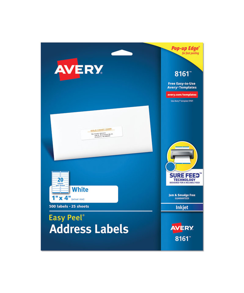 Create professional address labels quickly and easily. Perfect for high-volume mailing projects, labeling bottles, jars, food containers, product branding, event decorations, and more. Labels with Sure Feed® technology are designed to provide a reliable printer feed to help prevent misalignments and jams. The proprietary Easy Peel® feature makes applying the labels a breeze. Just bend the label sheet to expose the Pop-up Edge®, peel off the label and fold the sheet back to flat. Easy to customize with free designs and templates from Avery® Design & Print. 8.5" x 11" sheets for laser or inkjet printers.