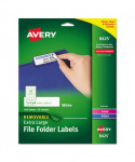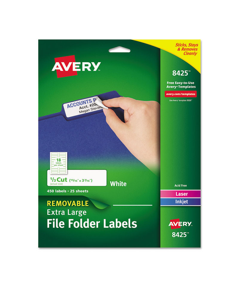 Labels stick and stay but remove cleanly when you have to make changes and revisions. Adhere to smooth surfaces including paper, cardboard, plastic, wood, glass, metal and more. Choose from white or colored labels that feature an eye-catching color strip at the top to make it easier to find just the folder you're looking for. The assorted colors make them great for color coding too. Easy to customize with free templates and designs from Avery® Design & Print. For laser and inkjet printers.