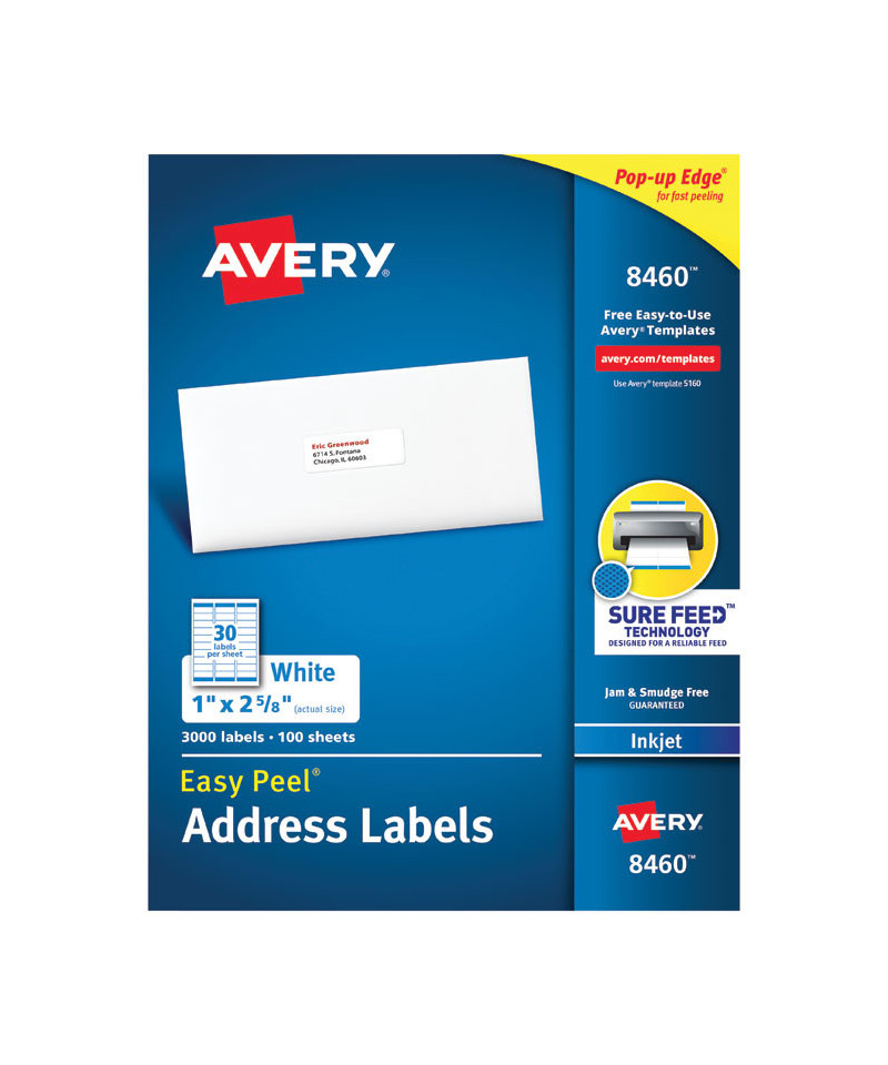 Easy Peel White Address Labels w/ Sure Feed Technology, Inkjet Printers, 1 x 2.63, White, 30/Sheet, 100 Sheets/Box