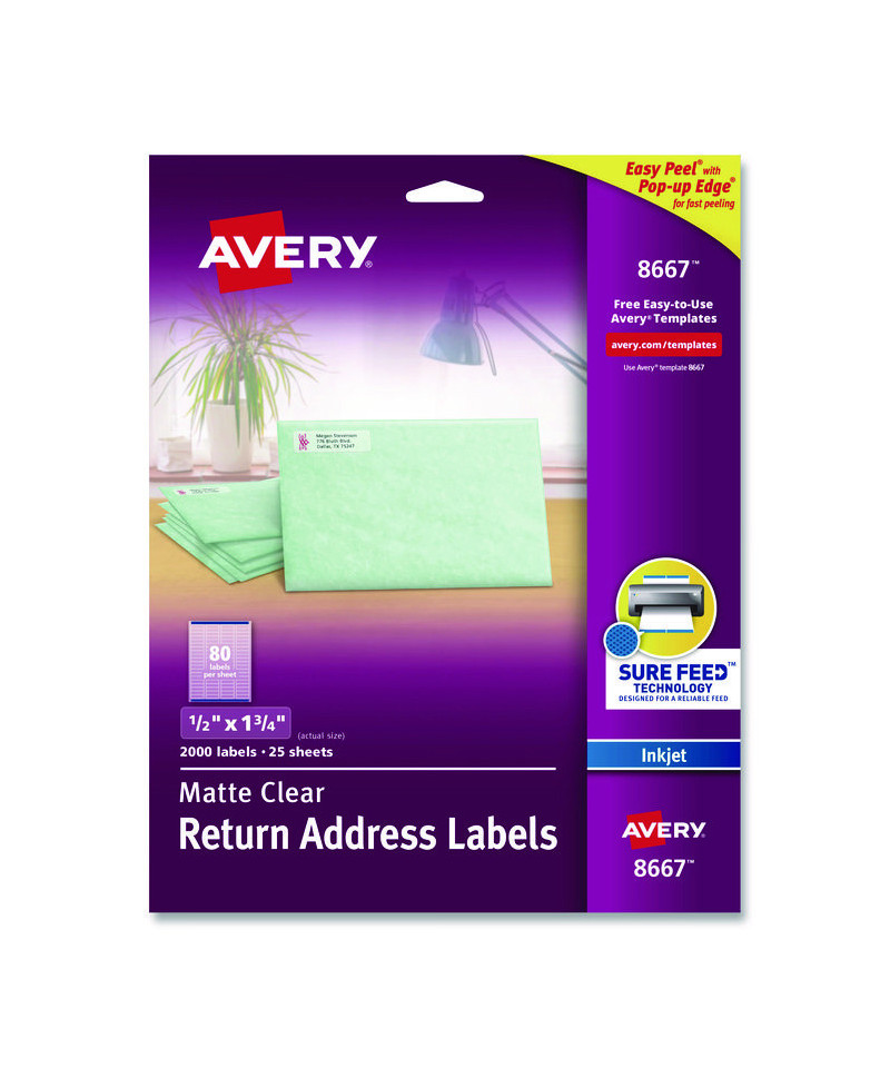 Create labels with a professional, printed-on look. Perfect for special occasions. Labels virtually disappear on white and light colored surfaces. Labels with Sure Feed® technology are designed for a reliable feed through your printer. Bend the unique Easy Peel® label sheet to expose the Pop-up Edge® for fast peeling; the sheet stays intact and goes back to flat. Easy to customize with free templates from Avery® Design & Print. 8.5" x 11" sheets.