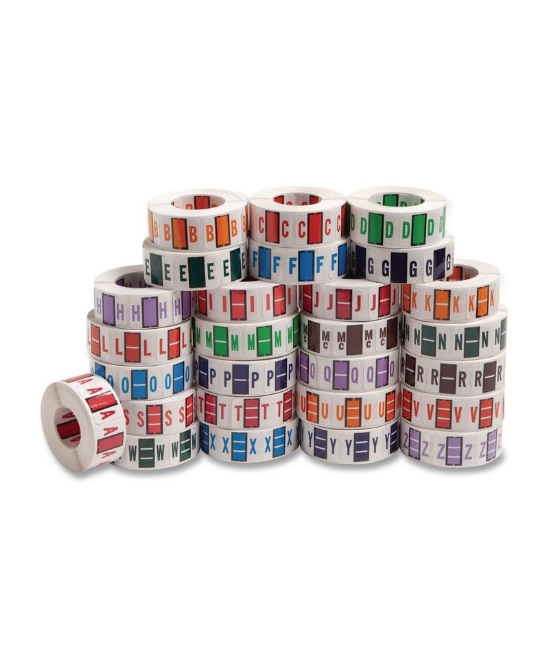Keep files organized at a glance with these alphabetic labels that feature a wraparound solid color bar and a colored character printed on a white background. Colors are compatible with end tab systems using the bar-style format. Convenient dispensing box for easy peel off and application. Includes 500 labels per roll. Compatible with Tab® Products 1283 series alphabetical labels.