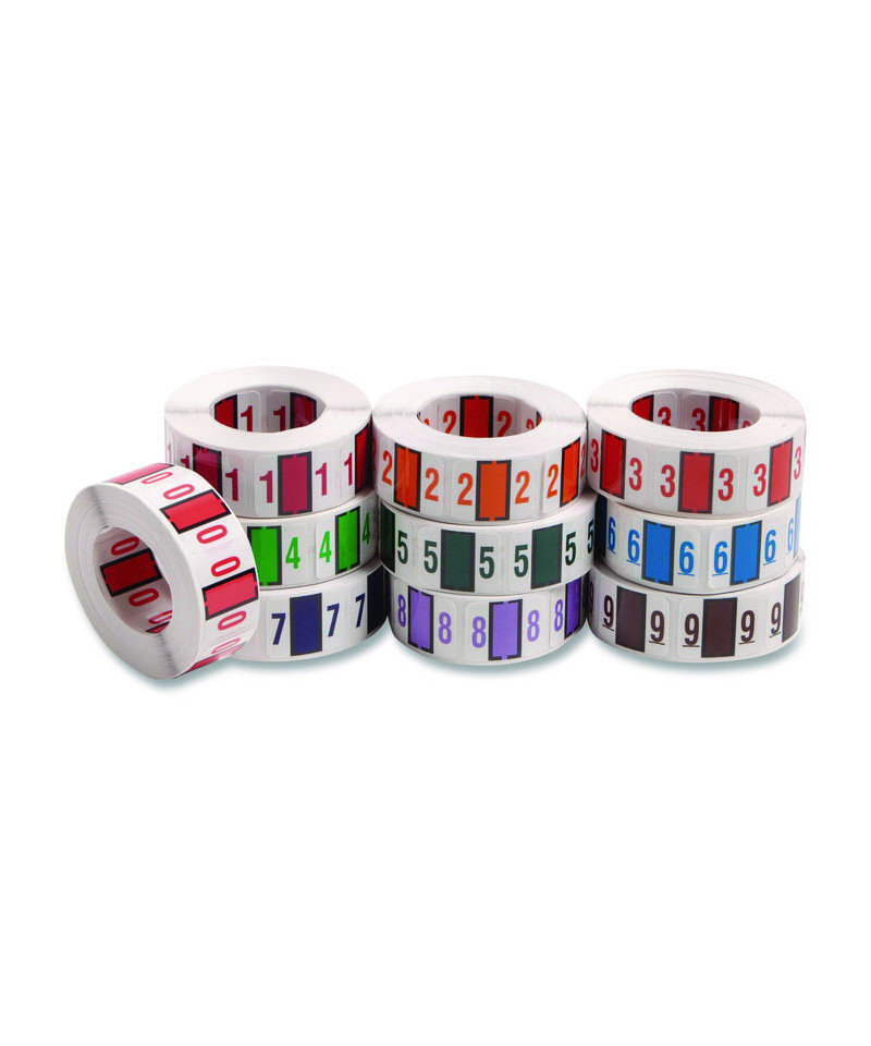 Keep files organized with pre-printed numeric labels. Featuring a color-coded wraparound design, they're easy to read from the front and back. Clear lamination not only prevents the smudging that's typical with regular handling, but it also prevents cracking along the center fold line to provide added durability. Convenient dispensing box makes application a snap. Ideal for end-tab, bar-style filing.
