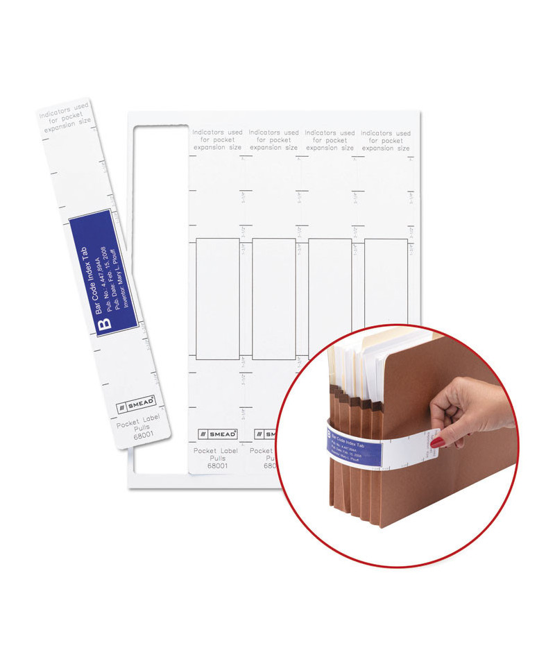 Quickly and easily label your file pockets. Pocket pulls make pocket shelf filing an organized color coded system. Aid in the removal of the pockets from any open shelf system. The tear resistant material makes the handle strong and durable and also extends the life of the pocket by preserving the gusset. Simply create and print color coded labels with the free Viewables® online label creator, apply to the band and then apply to the pocket. Indicator marks on the label identify correct placement of the bands for 1 3/4" to 7" pockets. Inkjet and laser compatible.