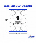 Laser/Inkjet Media Labels, Inkjet/Laser Printers, 2.5" dia, Matte White, 9 Labels/Sheet, 25 Sheets/Pack