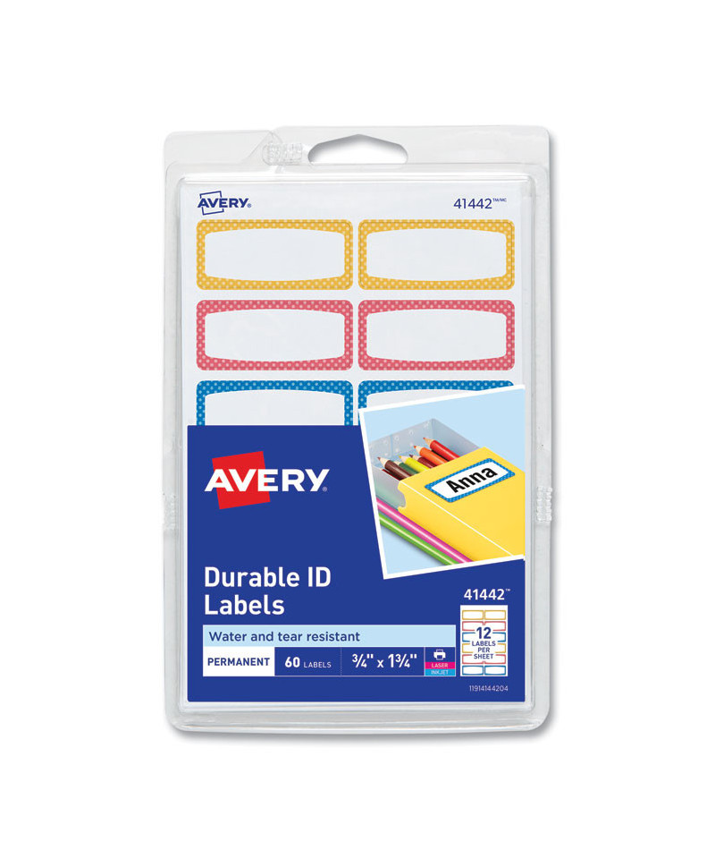 Help kids identify their belongings with the Avery durable labels. Water- and tear-resistant labels are perfect for daycare, school, camping gear, lunchbox items, bottles, sporting goods, and electronic devices. Simply write on with a permanent marker for quick and easy labelling of all your kid's items and keep them out of lost and found. White labels with assorted border colors and permanent adhesive backing. The TrueBlock technology allows you to completely cover up whatever is underneath the label.